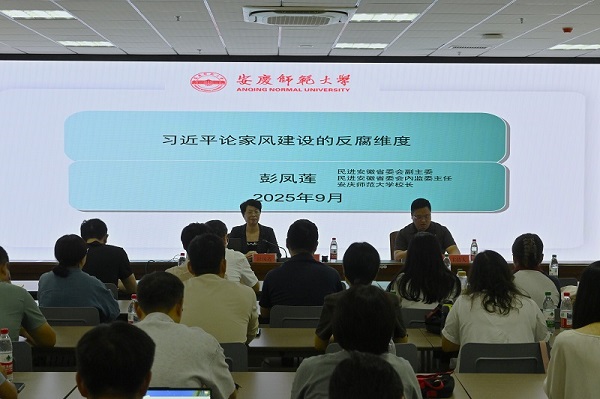 为深入推进“学规定、强作风、树形象”主题教育,进一步增强会员纪律与规矩意识,9月10日下午,民进安庆市委会内部监督专题学习会在安庆师范大学龙山校区举办,民进安徽省委会副主委、内部监督委员会主任、安庆师范大学校长彭凤莲应邀作题为《习近平论家风建设的反腐败维度》的专题辅导。民进安庆市委会主委潘连宇,副主委、市内部监督委员会主任都春宝,市监委会委员,基层组织主委、监督委员及市委会机关干部等60余人参加学习,都春宝主持会议。本次活动由安庆师大美术学院承办,安庆师大统战部、安庆师大美术学院领导班子成员及部分师生列席。